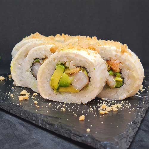 Camarón tempura, queso crema, ciboulette, envuelto en salmón, cubierto con crispy crocante y salsa de pisco sour